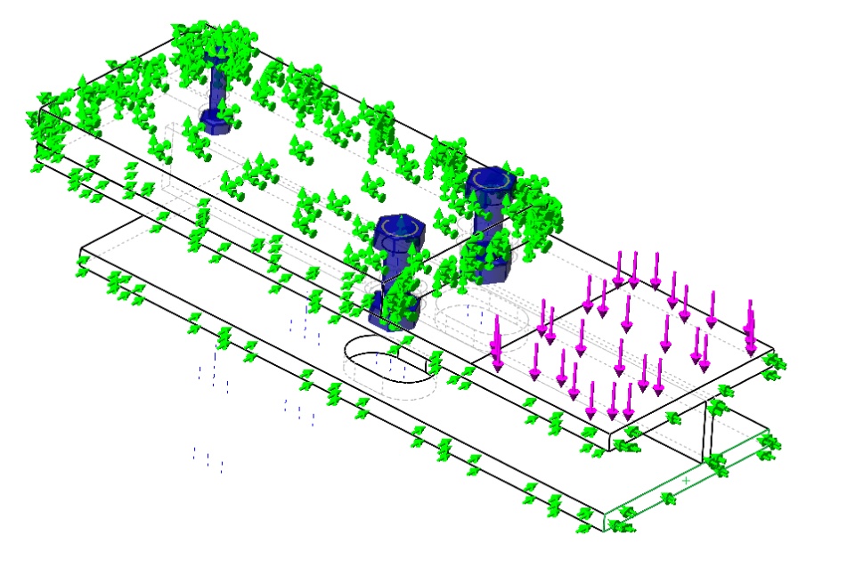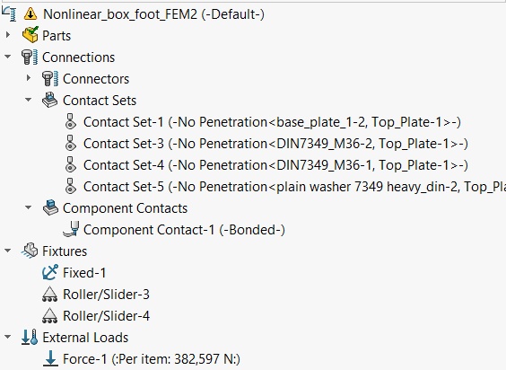 Hi.. I am trying to make an non-linear simulation with Plasticity material definition with appropriate tangent modulus. The model is a quarter section of the complete assembly with quarter of the total force applied on the relevant portion of the model. Model is very simple which involves 4 plates and 3 washers & has necessary fixtures - fixed and roller supports which are defining model symmetry. The assembly has 3 bolts (2-M36 & 1-M20) which are holding washer and lower part of frame against the upper plate which is secured with fixed constraint.