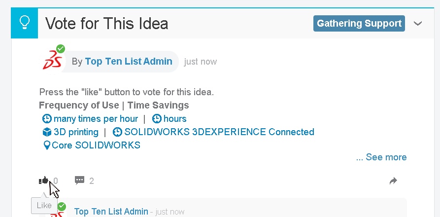 All ideas are considered by 3DS SOLIDWORKS development and the ten highest ranked ideas will be presented at 3DEXPERIENCE World 2024 in Dallas, TX.