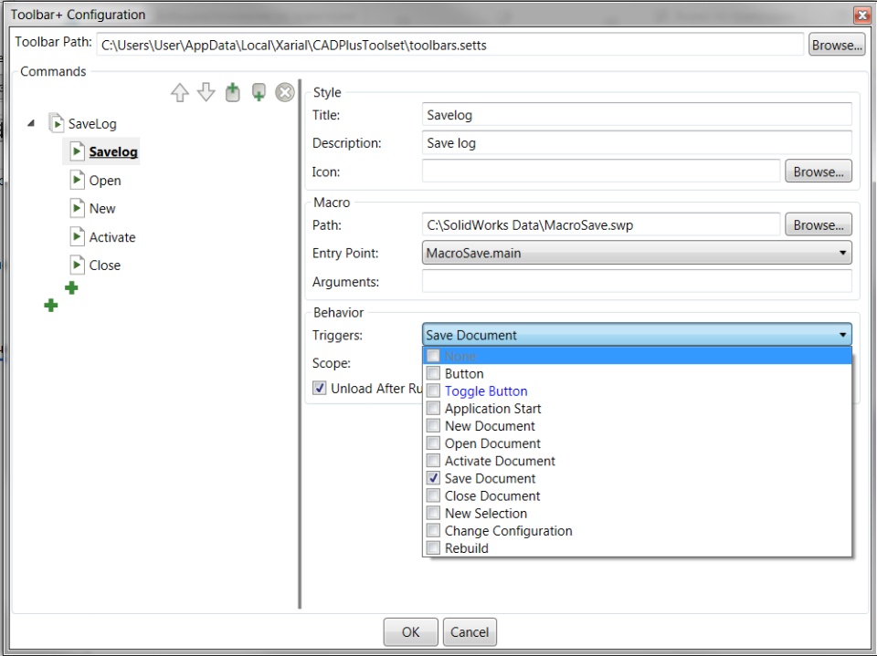 To install and use logging macros, I used add-inCAD + Toolset, it is free (registration is required to obtain a license), you can download it from the link https://cadplus.xarial.com/ where you can also find installation instructions.