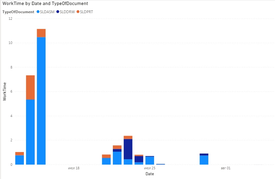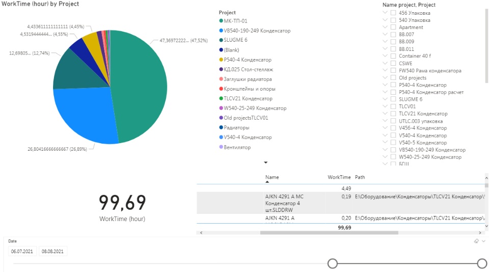 At the same time, they worked on the project in SOLIDWORKS for 12 days, of which only 9 with a time spent more than 1 hour. I went over to the drawings on 22.07 and worked on them for 4 working days.