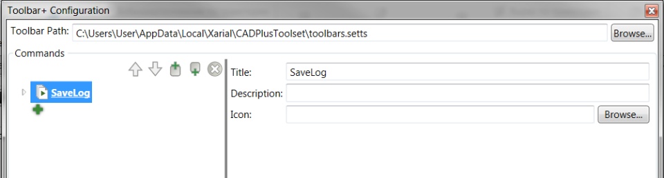 Next, select Toolbar + / Configure and create via + the SaveLog macro block, the block should be the only one (so far).