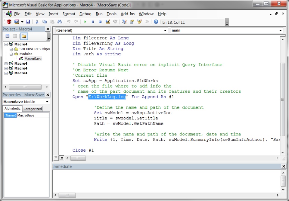 All macros have one common document where all actions are saved. The user must be registered in SOLIDWORKS documents, otherwise there will be no division by executor. Or, for each performer, you need to create your own macros with a separate document (log) for each user.