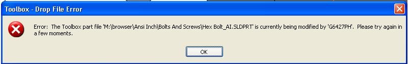 At my company we have our toolbox on a network drive. All theusers have read, write, modify (not full control though)access tothis drive. We are having issues where someone else will have anassembly open (where they inserted a fastener) and then nobody elsecan insert that same part.