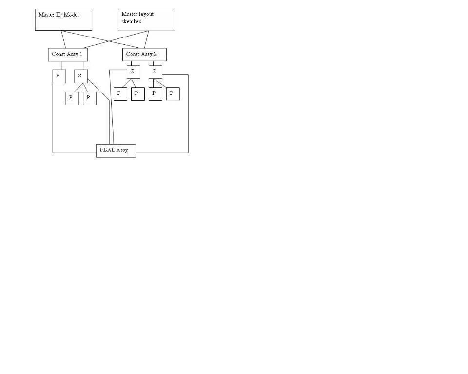 At the top level I have both an ID master model (just surfaces),and master layout sketches (as its own part). These are insertedinto multiple "construction assembles", that are used by thedifferent designers to build parts and sub-assemblies that arein-context to the master parts. These parts are then assembled intoa common "main assembly", which is for general consumption and NOTused for editing.