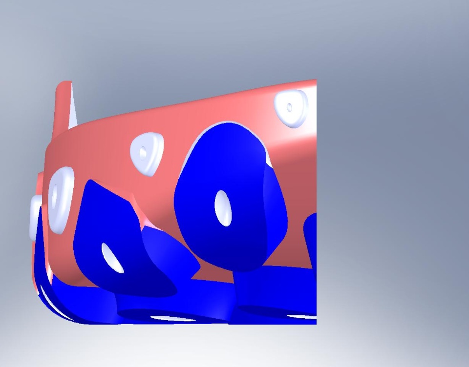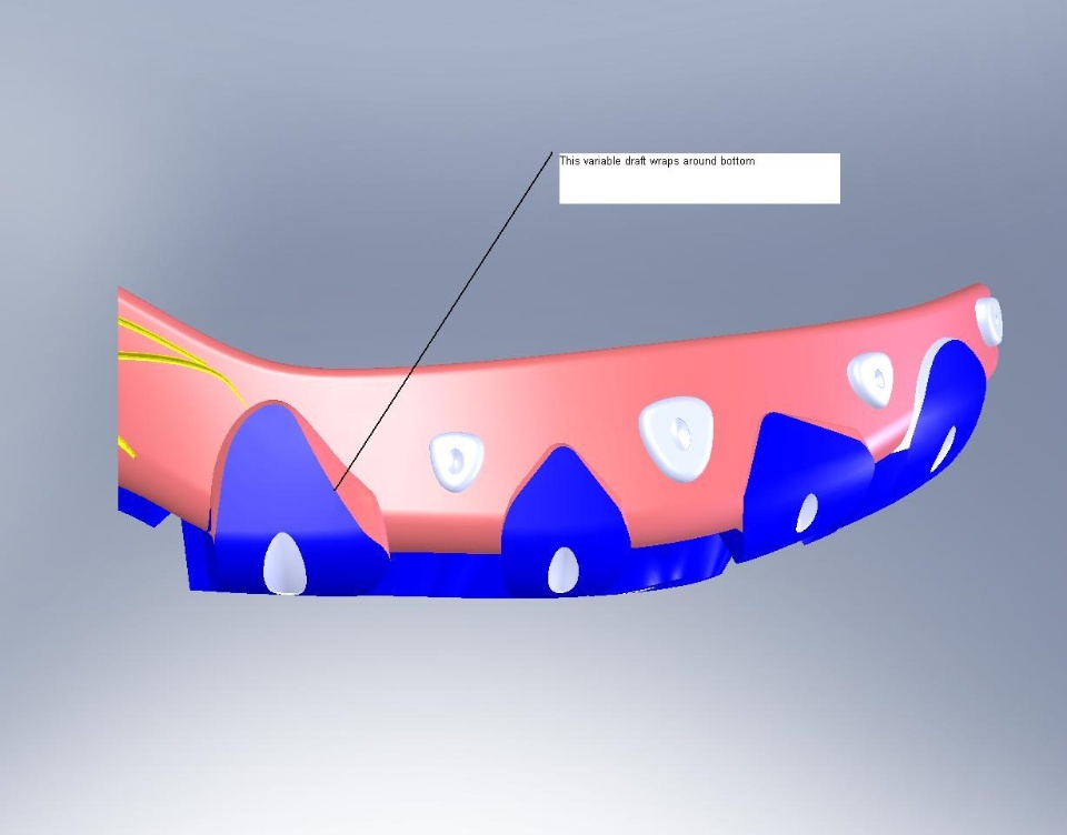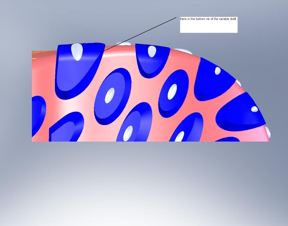 Does anybody know how to achieve this with cleaner data thanI wasable to. What I did was to extrude 3 surfaces. One at the topofthe lug, one at the area where the lug meets the sole and onemoreat the bottom of the lug (street surface). Then I createdsplitlines of desired shape on each of those surfaces respectively.Ithen lofted between each of these split lines to get theroughshape of the lug. I then came from the side and created thecutthat gives the side of the lug its shape before draft.Thenattempted to project separate curves from side and bottom(becausethe lugs also wrap around a radius) joined themwithcomposite 3D sketch and lofted surfaces between these curvestocreate the variable wrapping draft.SolidworksParts And Features