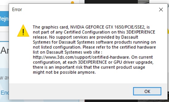 Hi, after I launch my 3DExp. launcher and insert my login credentials I get this error (photo enclosed). Before the login, I get a popup that my graphic card is not supported, but I can get through it. When I first used 3DExp I needed to install new graphic drivers to get through this error, but after that, I could click through it. If you have any possible solution for this problem I would be grateful. Thank you