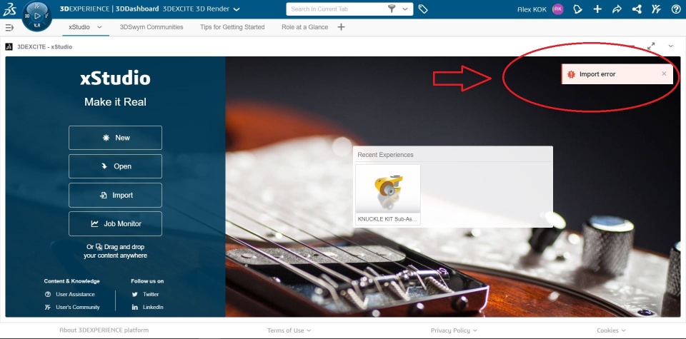 Question for the community on importing materials - I downloaded the materials definition from the xStudio dashboard and tried importing the 3dxml, both by drag-drop and by clicking on the "import" icon. After waiting for several minutes, the end result is the same: I get a not very helpful import error message. I have admin rights to the tenant I am working with and am able to grant myself the 3drender license from said tenant. I have confirmed the materials did not successfully get imported into the tenant and there are no pre-existing material definitions which are useable by xstudio.
