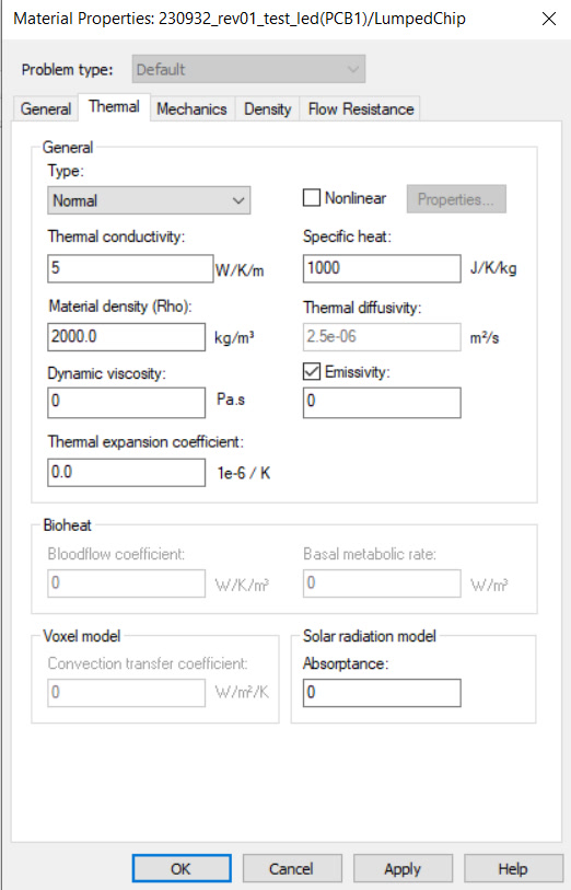Below is the material of my heat source, I just use the default value of 5 for the thermal conductivity, I tried to tweak the thermal conductivity but it did not work. which parameter can I tweak of my PCB thermal simulation using CHT solver to match my real measurement? thermalPCBTHERMAL PCB