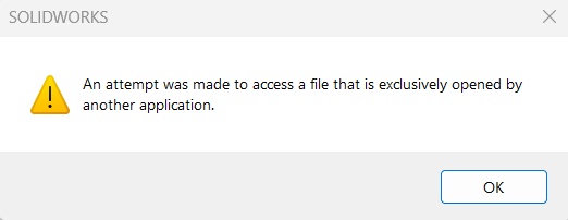 A sub-assembly file in SOLIDWORKS was corrupted when it was being saved to 3DExperience. When I try to open it, it displays "Preparing data" (Image 1 attached) and then gives the error "An attempt was made to access a file that is exclusively opened by another application" (Image 2 attached). This file is not open in any other application and cannot be opened by anyone in my 3DExperience team. Furthermore, this sub-assembly is part of a larger parent assembly that also gives the same errors when I try to open it. I have tried multiple solutions including: restarting/reload from server, trying to overwrite the corrupt file, decoupling the child sub-assembly file from the parent assembly, and creating a new parent assembly. None of these solutions have worked and many other possible solution cannot be done because neither file can be opened. Deleting the parent assembly is a last resort since there a hundreds of references in that file that would take tens of hours to remake. If anyone has any ideas how to remove the child sub-assembly from the parent assembly or overwrite the child, it would be very appreciated.