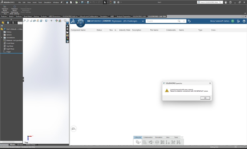 A few seconds after I get that error, there is another error message that says that it "failed to establish connection with 3DEXPERIENCE server" (see second picture)