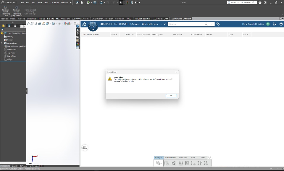 I'm trying to use the 3DEXPERIENCE "Design with SolidWorks" app, but when I open the SolidWorks desktop app I get an error that says "Login Failed" (see attached picture).