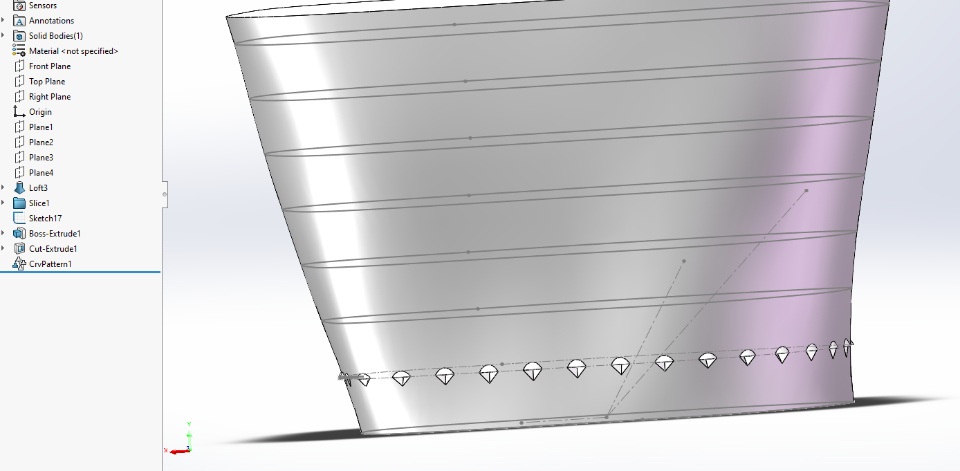 My current ideas are: idea 1. Using slicing tool to get many reference planes and intersecting lines with the basic body, then sketch the teeth on each layer (costing much time, how to automate?). Then the teeth can be arrayed by the curve-driven pattern tool along the intersecting lines.
