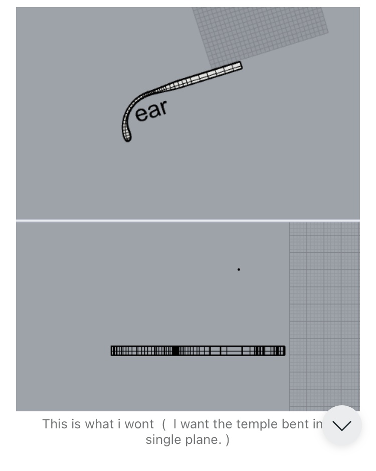Hi everyone, I'm trying to bend the temple of an eyeglass as shown in the first photo. However, when I use the Bend command, the temple bends in the opposite direction to what I want. I've tried searching online for videos, but I can't find anything. Can anyone help me? Thanks in advance and have a good evening. Best regards