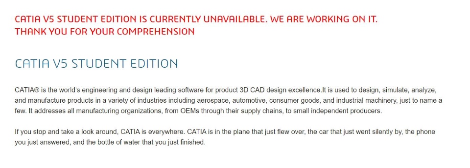I bought last year the student edition of Catia V5, but now the licence is end. So i need to buy the new licence for continue my studies. But there is a problem, here in Italy, if I open the link of the student version (https://edu.3ds.com/en/software/catia-v5-student-edition) there is the error message I've attached. Can someone tell me how much I have to wait? Is there someone i can contact to buy the new licence?