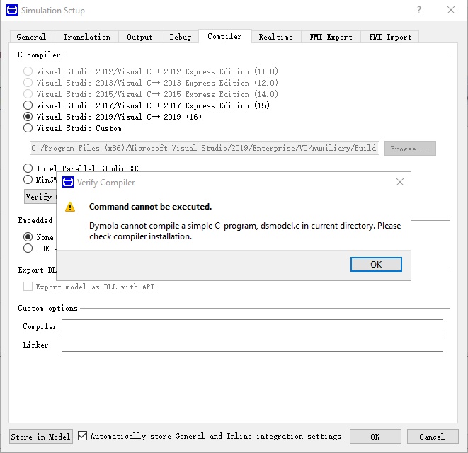 I use Windows 10. Visual Studio Enterprise 2019 is installed (built with C++/CLI support) and I can run C++ code in it. Then I open the Dymola 2021x as an administrator, selected VS 2019, and got the following error. I also tried to install other versions like 2015, 2017. The problem cannot be solved.