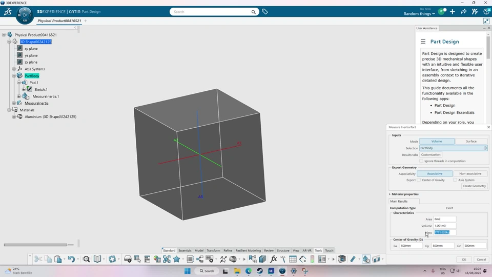 I applied Aluminium material with density set to 2710kg/m3. So with a volume of 1m3, the part should weigh 2710kg.