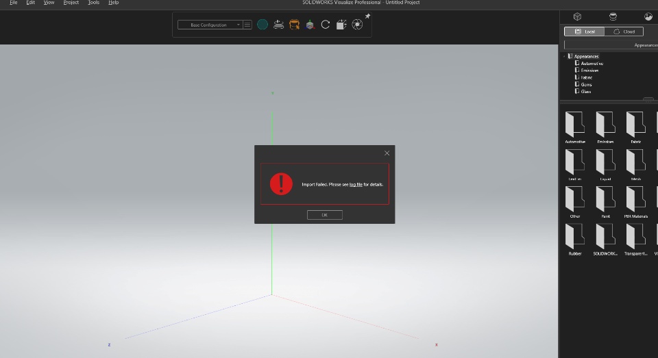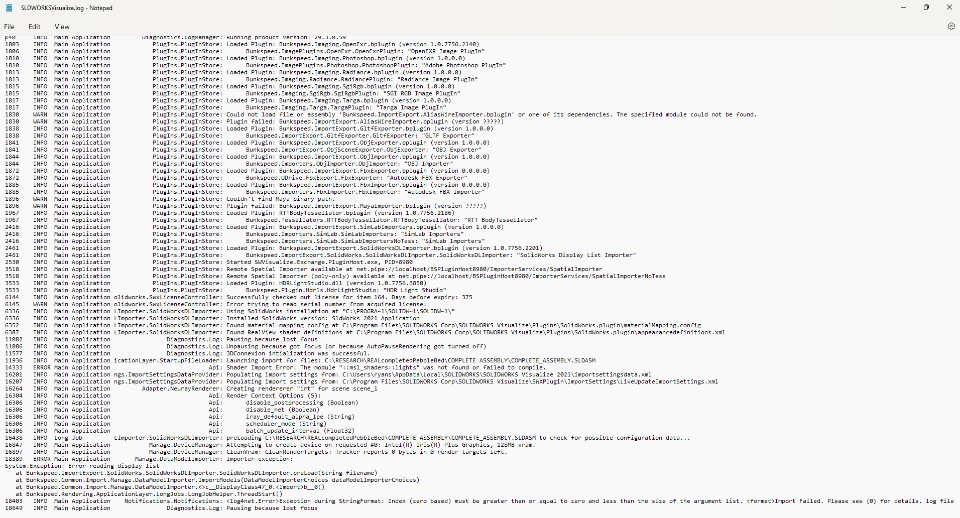 I am trying to export a decently large assembly to visualize in order to make an animation. I have about 30 configurations of the assembly that I want to step through, but every time I attempt to import into visualize I get a "failed to import file" error, and am prompted to check the logs. I have attached the error, as well as the log-in question