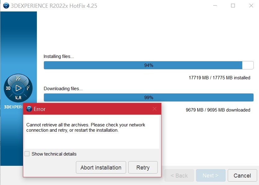 I just bought the 3DExperience CATIA for Students and downloaded the 3DExperience Launcher. When I try to install other apps needed, I get an issue and the installation stops at 99% and I get an error message: "Cannot retrieve all the archives. Please check your network connection and retry, or restart the installation." I tried reinstalling, but it still didn't work.