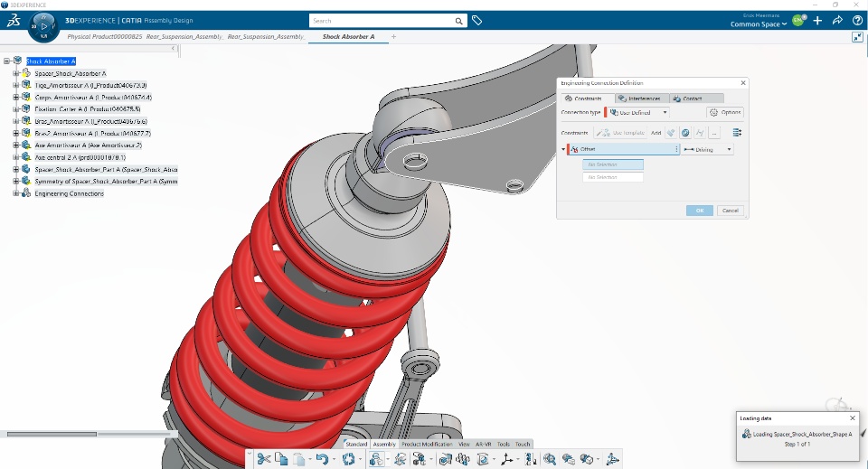 Following the tutorials for the CATIA Mechanical Designer Associate "Modify and Simulate Assemblies" and "Reuse and Modify External CAD Data", the Engineering Connection command does not work as shown in the videos. Attempting to select geometry after selecting the Engineering Connections command results in a dialog box titled "Loading Data: Loading *part name*" briefly, then the part becomes unselectable and no element populates in the section box, preventing any further progress in the tutorial. Has anyone else experienced this issue and what is the solution?