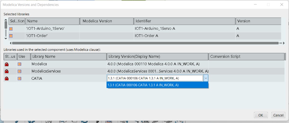 I'm currently working on the Arduino Servomotor learning library. When I check if I have the specific libraries needed to run the simulation I find that I have to import the Catia2.0 library. I have imported this library numerous times and it is successful every time. When I go to update the library the only option available is the Catia1.3.1 which can be seen in the image attached. Any help would be appreciated.
