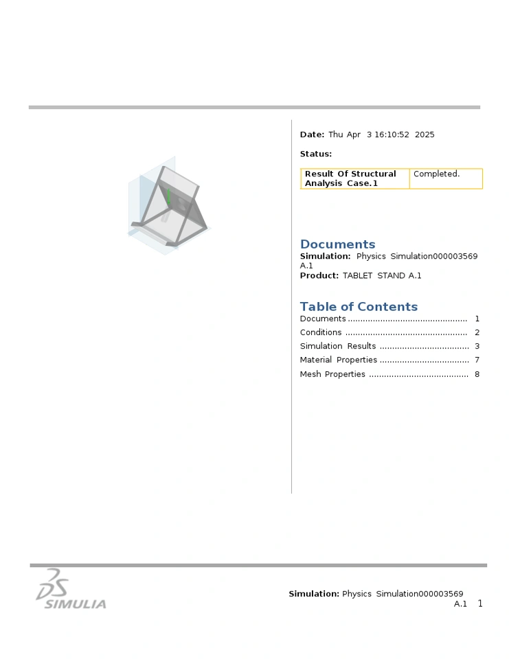 This study investigates the mechanical behavior and design efficiency of a tablet stand made from ABS plastic. The goal was to develop a lightweight, structurally sound, and material-efficient design using parametric CAD modeling and Finite Element Analysis (FEA). The final optimized model shows a maximum Von Mises stress of 1.05e+4 N/m² and displacement of just 0.000451 mm under a load of 0.101 N, confirming strong structural integrity. Mesh quality remained high throughout, and mass was minimized to just 0.401 kg with a volume of 0.000393 m³.