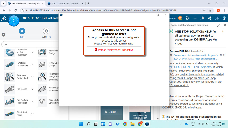 I am encountering an issue with the 3D Experience application. When I attempt to open the Part Design feature, a pop-up message appears stating: "Access to this server is not granted to the user, 'user' inactive."