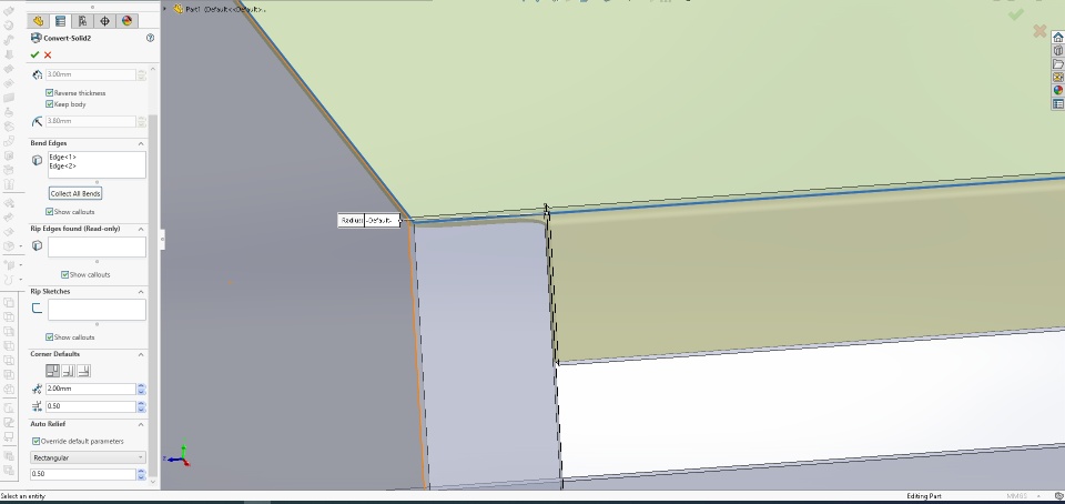 "Convert to Sheet Metal" multi-body model, unable to achieve reliefs on corners
