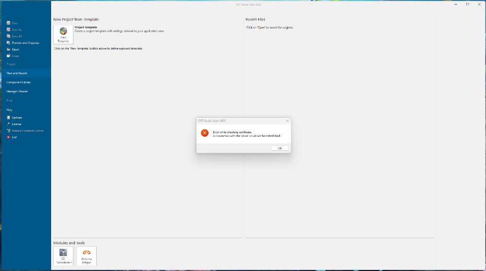 I am unable to get CST Studio to work on my machine. Every time I try to start the program I get this error message, "Error while checking certificate. A connection with the server could not be established." The error message doesn't come up imediately. The program will open, then about 30 seconds later the error message come up.