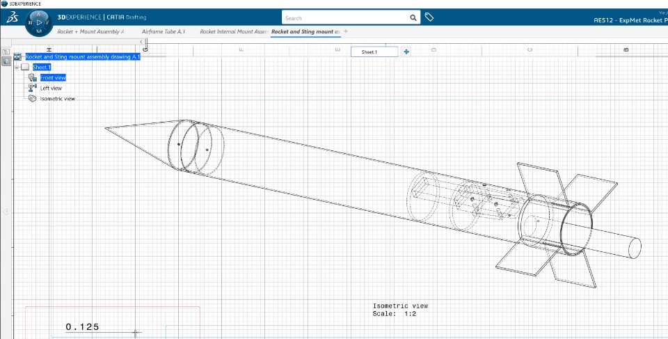 I'm currently drafting a wind tunnel model of a rocket. However, in my drafting file, part of the mount inside the body tube is hidden even though its visible in the assembly file.