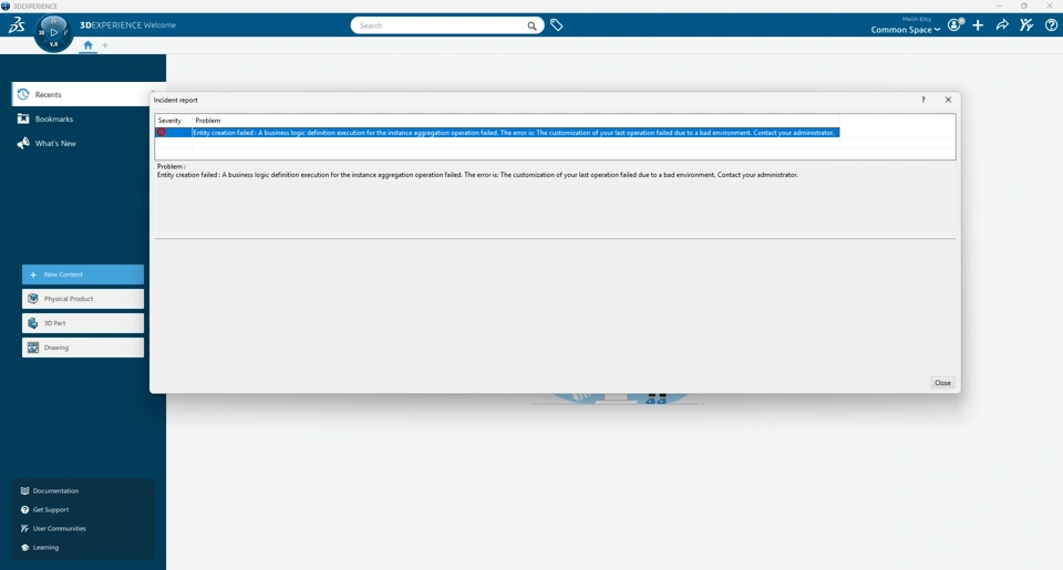 I see this error when I start a new part design. I need your help.Entity creation failed : A business logic definition execution for the instance aggregation operation failed. The error is: The customization of your last operation failed due to a bad environment. Contact your administrator.