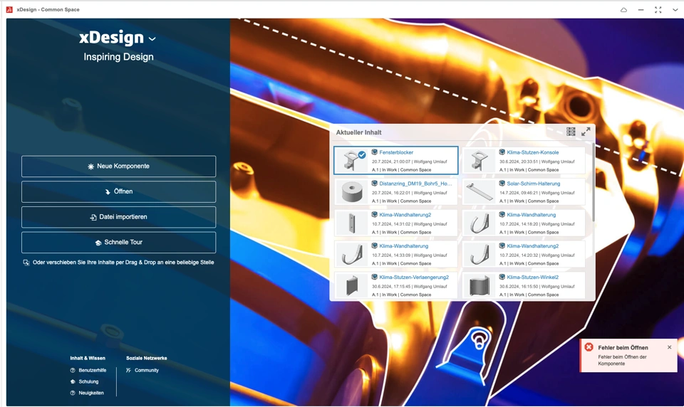 whichever part I try to open in Xdesign, there is always an "File open Error" - how to solve it?