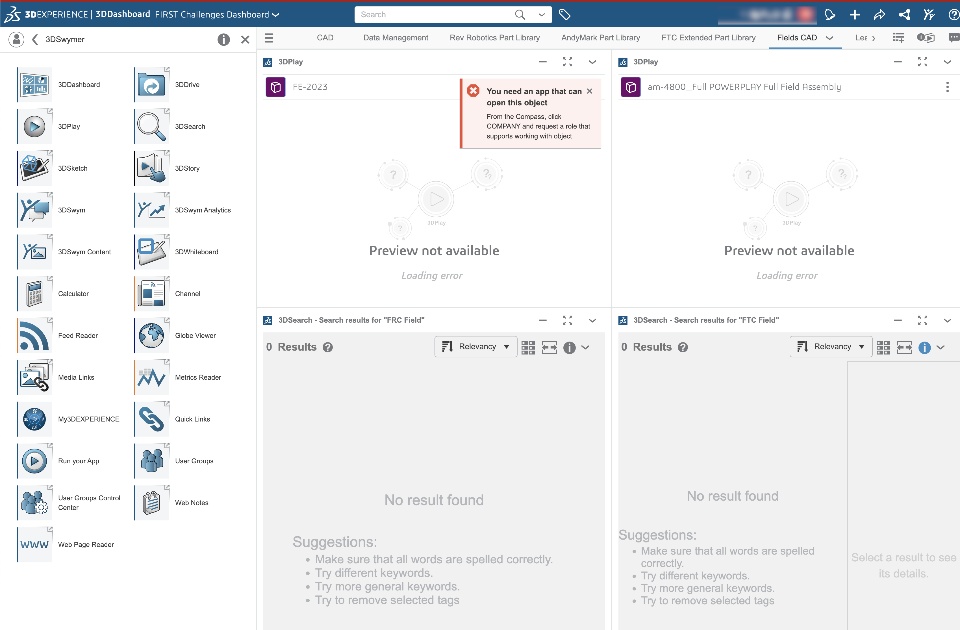 I just received the invite to sign into 3DExperience and add the "FIRST Challenges Dashboard". I successfully added the dashboard. However, most of the listed libraries show "no results" or similar. And I'm seeing messages that I don't have the right role/app to open a 3DPlay file like 'FE-2023'. Can someone help?
