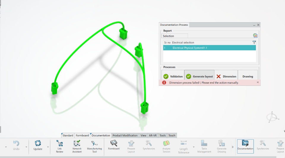 With the "documentation process" command, I am trying to generate the drawing for the harness. It fails after "generate layout" and shows an error that dimension process failed. Attached is the screenshot related to the problem. kindly can anyone guide me what is the issue?