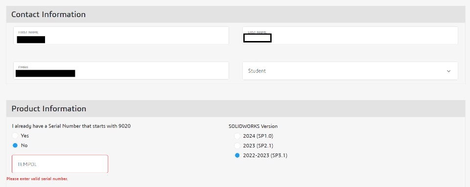 Hi, I am a student and trying to use the 60 day free trial of solidworks. I go to https://www.solidworks.com/how-to-buy/get-education-trial ,and follow the steps. Once I fill the form and press "Request Download" I get an error that says "Please enter a valid serial number." as shown in the picture attached.