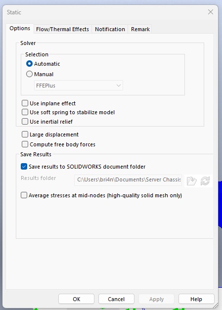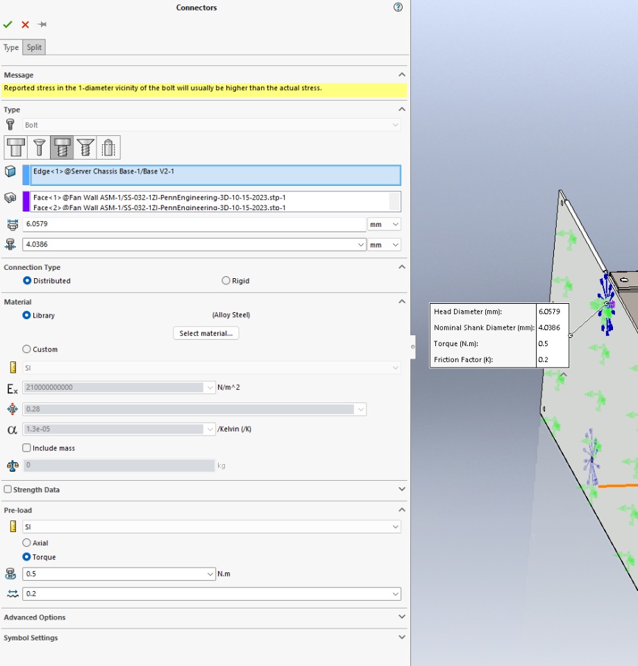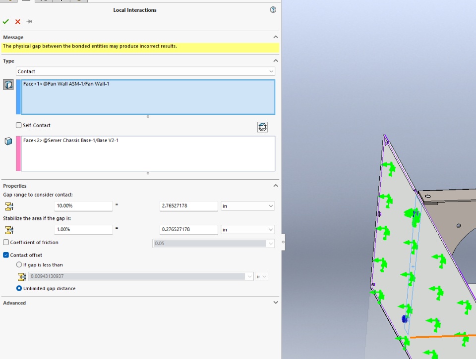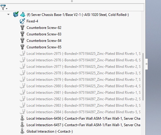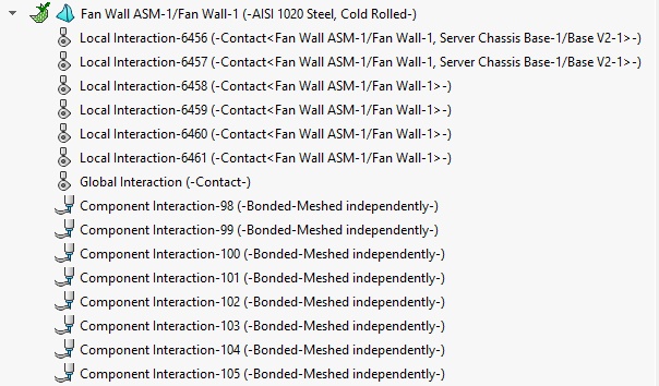 I have a model with two parts. An outer sheet metal part is the base with an inner part to hold fans. The inner part has clearance of 0.015". I'm using PEM self-clinching nuts and #10-32 screws to fasten the parts. Each gap of the inner part has a local contact interaction for unlimited size. There is a local contact interaction for each side of the inner part being fastened to the outer.