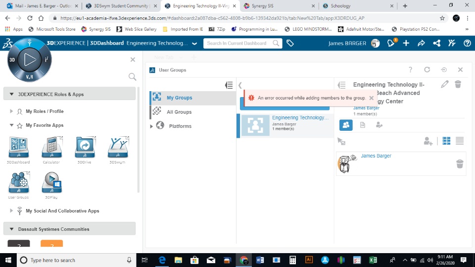 I am listed as the owner of a new group, but when I try to add students (users) it gives me an error message