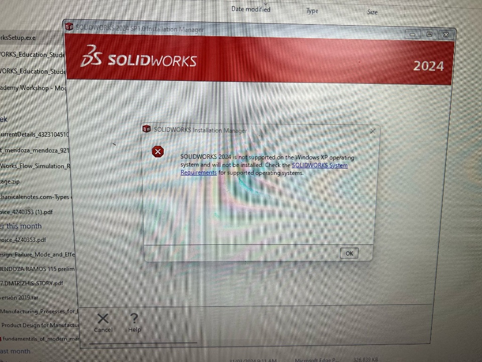 Hello I am trying to installed SolidWorks Studen version but hen I run SolidWorksSetup.exe appears a small windows (SOLIDWORKS Installation Manager) where mention that Solidworks 2024 is not supported on the Windows XP ....... after click OK button ... all process finished, however mi PC has Windows 11 Pro installed as show picture, could give me some reason that I can installed Solidworks 2024 student