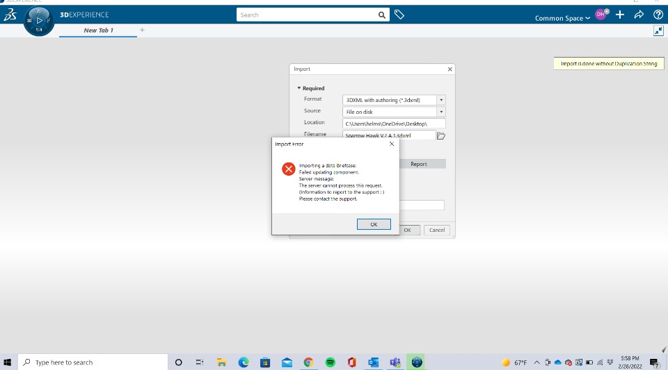 I made this as a generic post earlier but I wanted to raise it as a question/issue. I am having trouble importing, exporting, saving, -- etc. 3dxml files in Catia v6. I have seen some similar posts and am seeing if there is a solution yet. I have tried clearing the cache in the client cache as well as my browsers but to no avail I still can not import or even save and export part files in 3de Catia V6. I have attached a screenshot of the window I get while its trying to import.
