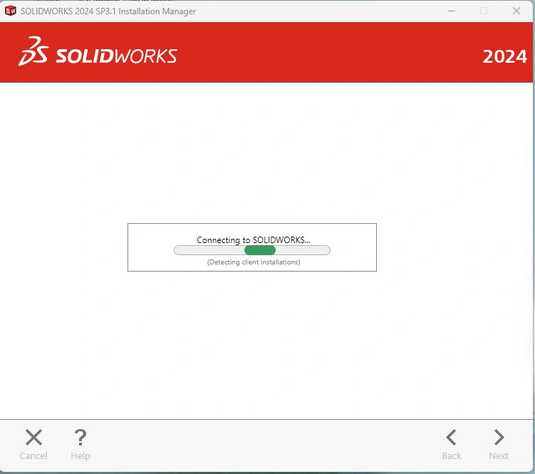 Now I started the installation but after that I provided my licence, it just stand on Connecting to SOLIDWORKS... (detecting client installation ) and never go forwars to start the real installation.