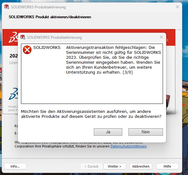 Hello, I have installed SW2023 with an education serialnumber from my univerity. When I want to activate the licence it tells me that the licence is invalide. The total number of activations isn't reached and there is no other licence activated or saved anywhere on my laptop. The licence my university has is valid till the 31.7.2024.
