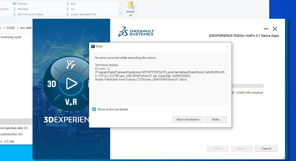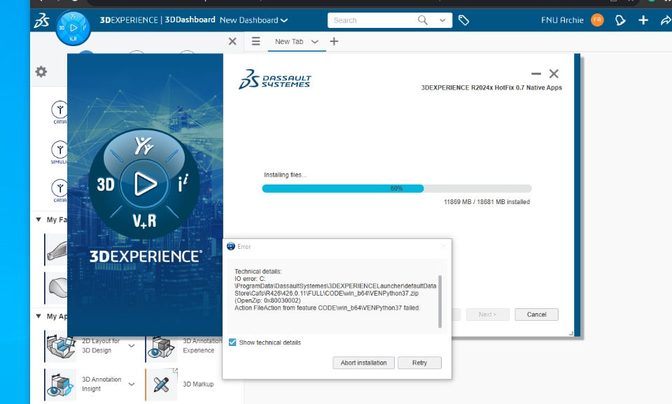 I am writing this post regarding the current update on 3DEXPERIENCE that I have been dealing with. My laptop has been having trouble installing the updates for 3DEXPERIENCE R2024x HotFix 0.7 and 0.1 Native Apps. I attached a couple of screenshots for reference. I tried uninstalling and reinstalling the programs I had in 3DX but it seems that I have been stuck with the same issue. I was wondering if anyone here has advice or solutions to this. Thanks a lot everyone!
