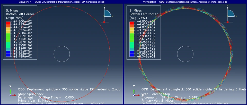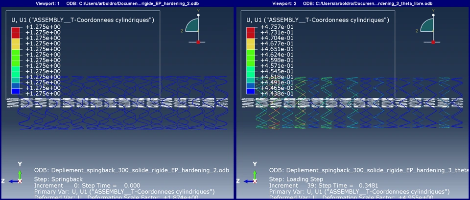 Hello everyone, I simulated the inflation of a stent by imposed displacement on each of the nodes. Thus I created a cylindrical frame (R,theta,Z), since my stent is folded around the Z axis. I then imposed a radial displacement U_R on each of the nodes. I left the other DOFs free, except for one node where I also blocked U_theta (orthoradial displacement) and U_Z to avoid rigid solid movements. I used an elastoplastic material with a yield strength of 480, and a very low isotropic hardening (i.e. almost perfect plasticity) "plastic_table": [ [480, 0.0], [580, 100000], [680, 2000000], [780, 3000000] ],