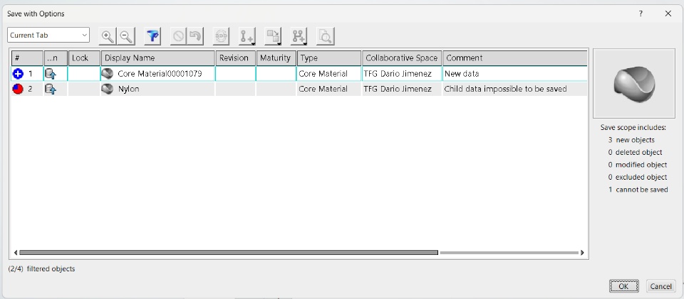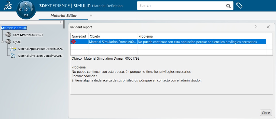 Then I try to create a new one like "Nylon" applying some of its properties like density, young module and poisson's ratio. I don't have any problem to apply it to a design and simulate it, the problem appears when I want to save the design or export it. A message appears saying that i don't have the privileges to save it.