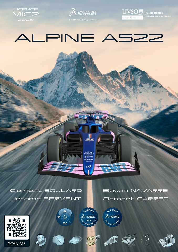 We are a team of 4 students, Clément CARRET, Clément BOULARD, Elouan NAVARRE and Jerôme BERMENT. We are proud to present our Professional License Project. As part of our project, we modeled the Alpine F1 A522.