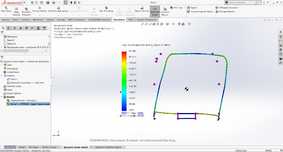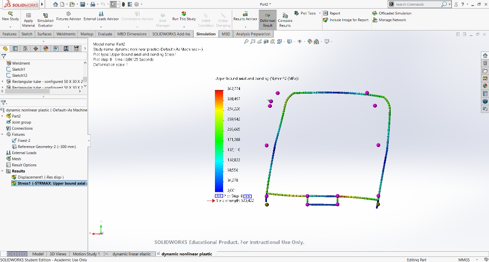 Hi, Im running a simulation for a college work. We need to obtain a force/displacement curve from a heavy vehicle security arch. Problem is: Im running both nonlinear simulations to compare the behavior of the beams. Everything is exactly the same in both simulations except the model type material (1 - Linear Elastic Isothropic and 2 - Plasticity Von-Misces). But the results don´t make much sense tbh. I have large displacement and strain on. The Stress Strain curve seems ok (Solidworks library). Now what i expected was both simulations should be similar up to the yield point, and then diverge from there. However the Plasticity one doesn´t even reach yield stress. If someone could help out I'd greatly appreciate it.