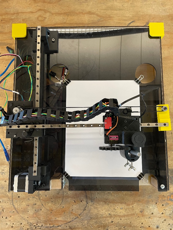 Following the construction of the assembly, we used Python to develop an image processing program that would construct a list of instructions from a camera input. Utilizing the OpenCV library, the computer uses a Gaussian threshold image processing algorithm to convert a colorful image to a black and white image of where dots should be put on the page. This image is treated as a list of points and goes through a closest-first path generation algorithm, which immediately converts the path to instructions for the arduino, including instructions to adjust the pen height according to the cantilever’s drop as it moves horizontally. Once fully processed, the instructions are sent over serial communication via the USB to the Arduino Uno. The Arduino Uno runs code to accept these custom instructions sent over the serial communication and sends the necessary signals to stepper motor controllers and the servo motor. Utilizing the limit switches, the Arduino Uno can also handle a reset to zero the printer, which is used at the start of every print.