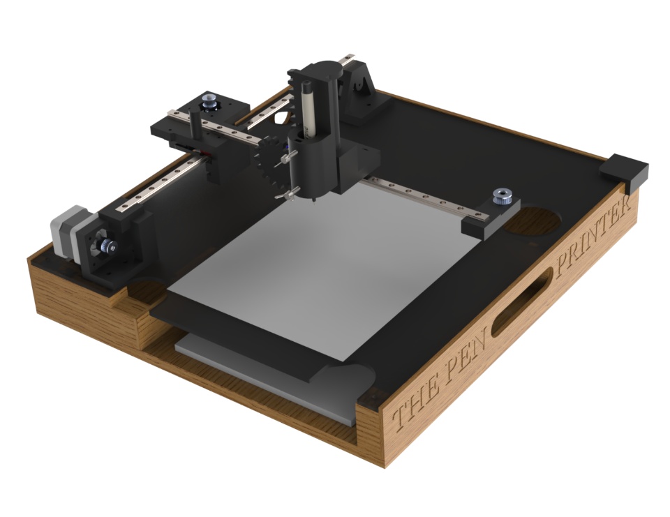 The Pen Printer was our Engineering Honors final project at Francis Parker School, and as a pair of high school sophomores, we spent approximately 9 weeks on the design, programming, and refinement of the machine. The project's goal was to create a CNC-style printer with the ability to process and output both dot and line art in just a few hours. Consequently, the final design has three degrees of freedom, with the ability to move in the X, Y, and Z plane. Utilizing stepper motors with accuracy of up to 0.1125 of a degree in the X and Y axes, the printer can achieve an astounding resolution of 3840 x 2160, barring physical limitations from the width of a pen. In actuality, this yields resolutions of 635 x 476 when utilizing a 0.4 millimeter pen tip, still enabling the creation of high quality images. The stepper motors — with GT2 timing belt wrapped around a pulley — ensures rapid movements, which would otherwise be lost with a leadscrew mechanism, whilst still maintaining the desired precision of a CNC machine.