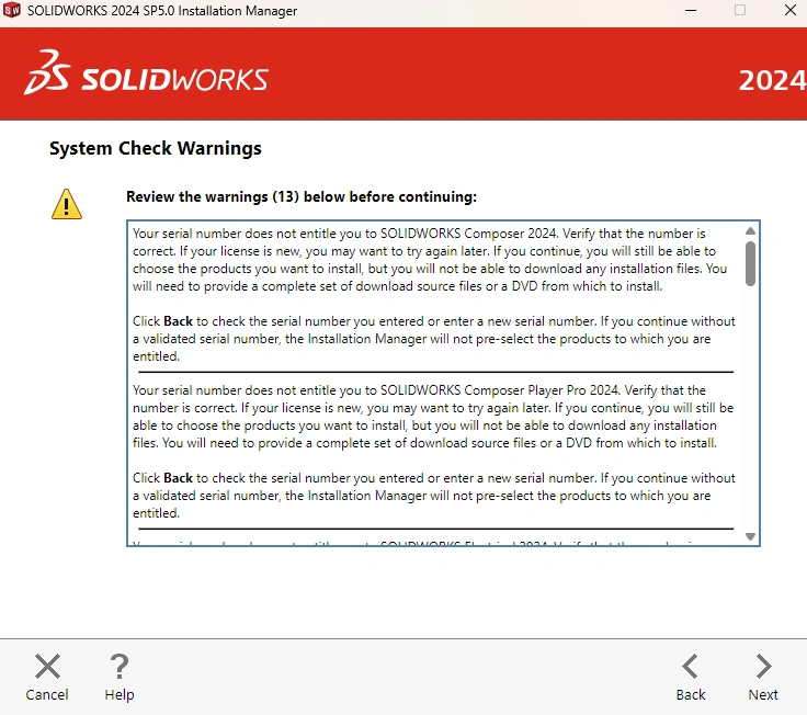 I have the student edition serial number, but during installation, I'm receiving a system check warning when verifying it. How can I resolve this issue?