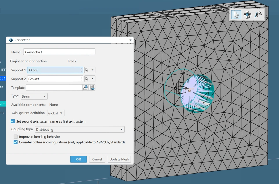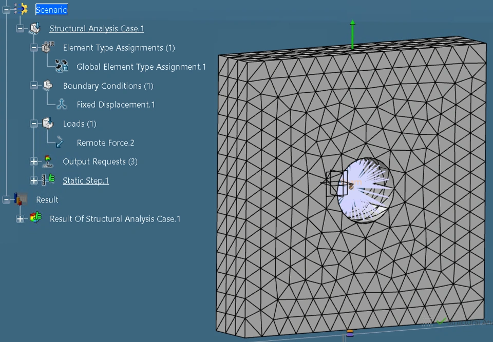 Remote force applied to top face, reference point input being set to "specify." Fixed displacement at the bottom face