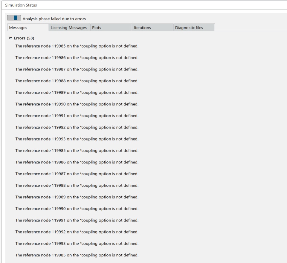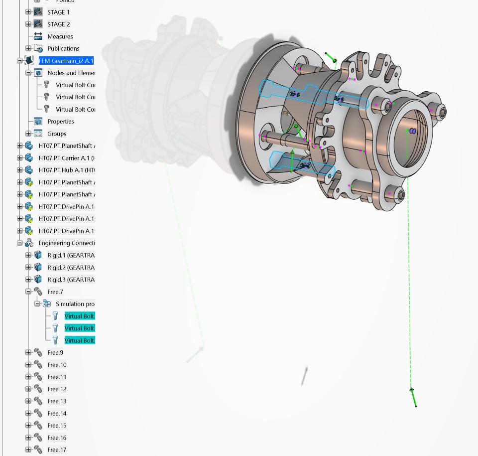 Hello, my team has been running into an issue when running a multi-part static simulation using 3DExperience SIMULIA for a scenario as shown. The issue seems to resolve when adding any connection to the FEM model, though in this particular model, there is no need for connections in the FEM model to represent our system accurately. Is there any way around this, or are we doing something wrong? The FEM model consists of tie connections and 3 virtual bolts, general contact is assigned to the model, and we are running 2 static steps in series. The simulation errors immediately during the bolt preload step